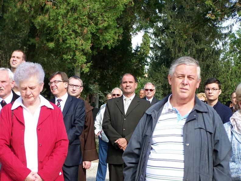 Tál Zoltán plébános atya a megjelentekkel együtt közösen imádkozik az elhunytakért, majd a mauzóleumot újból felszenteli